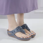 Genuine leather beach flip-flops for women at the beach, fashionable wedge-heeled outer wear, thick-soled non-slip summer new style flower flip-flops