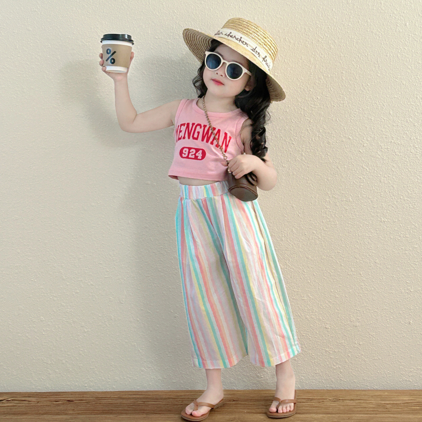 Girls' colorful striped beach vacation casual pants 2024 Summer new western style loose all-match cropped wide-leg pants