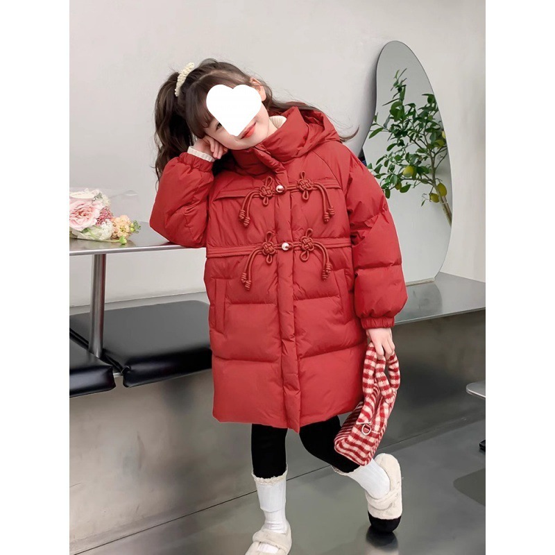 ملابس الفتيات المحشوة بالقطن ملابس الشتاء 2024 معطف أحمر جديد للأطفال سميك شتاء رأس السنة الجديدة ملابس تحية متوسطة وكبيرة للأطفال ملابس مبطنة بالقطن