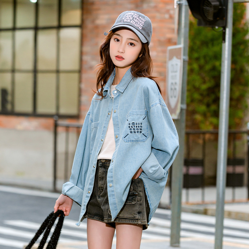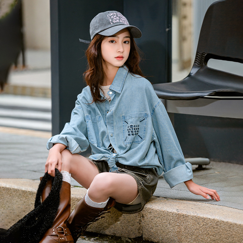 قميص دينم للفتيات لربيع وخريف 2024 قميص بنمط جديد بأكمام طويلة وطية صدر السترة ملابس ربيع على الطراز الكوري