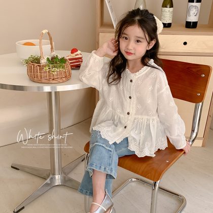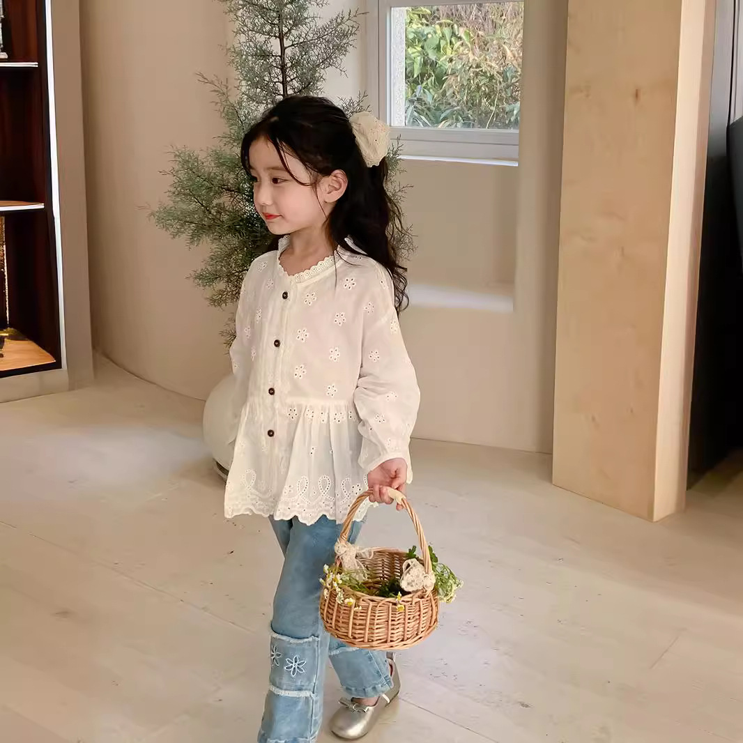 | nameOriginal | Girls' Lace Shirt 2024 New Baby Spring Cotton Princess Style Top Children's Doll Shirt White Shirt |