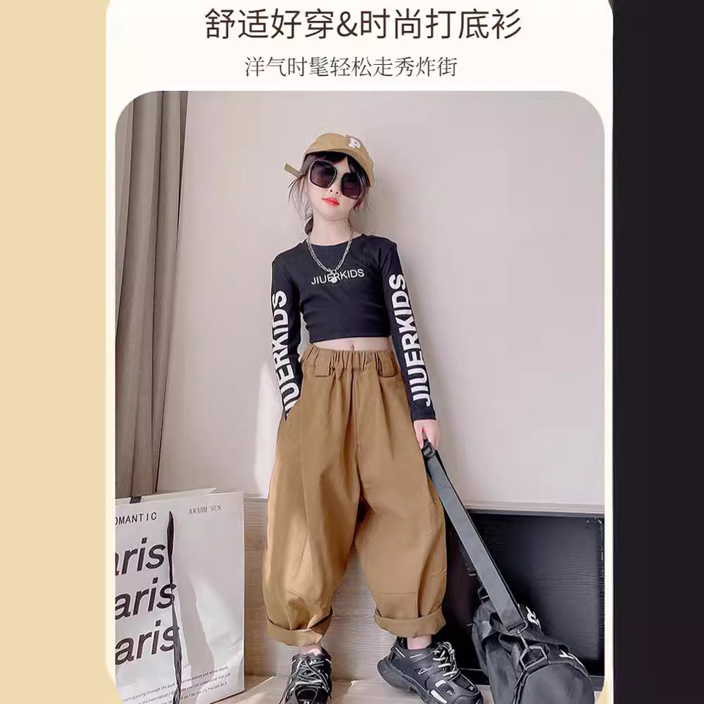 Girls' Long-sleeved T-shirt Spring and Autumn High Waist Western Style Small Shirt Slim-fit Black and White Base Shirt Children's Navel-exposed Short Top