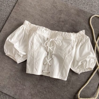 Girls New Summer French Square Collar Navel Short off-shoulder Top Women's Stylisch Short-sleeved Shoulder Shirt Parent-child