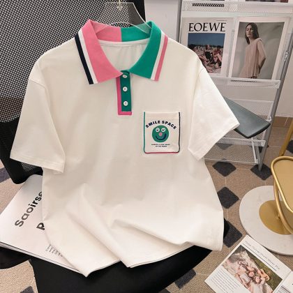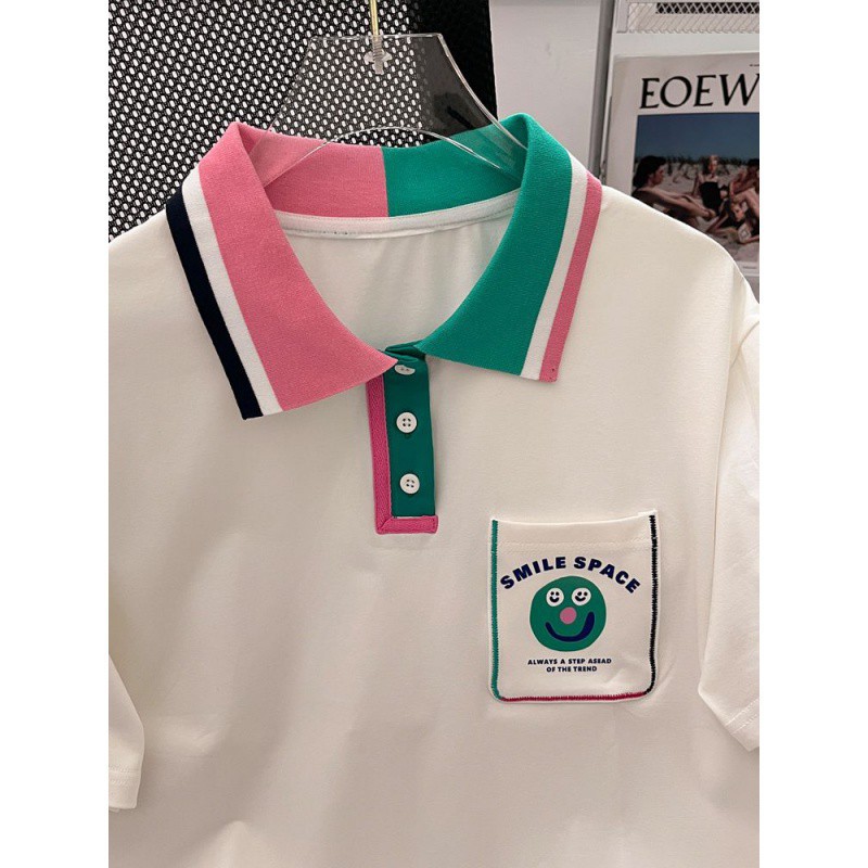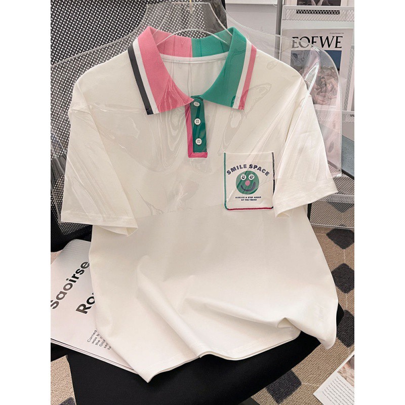 قميص بولو للفتيات صيفي بأكمام قصيرة وطية صدر السترة على الطراز الجامعي على الطراز الكوري فضفاض جديد يناسب الجميع توب بناتي عصري