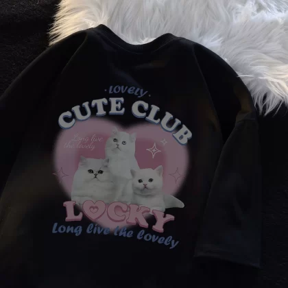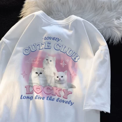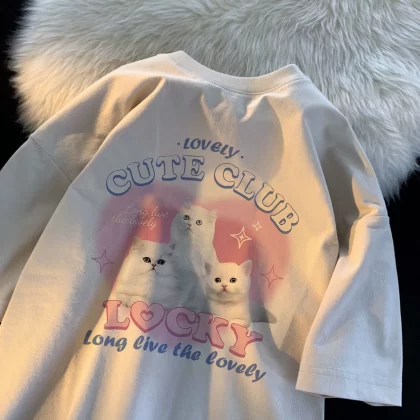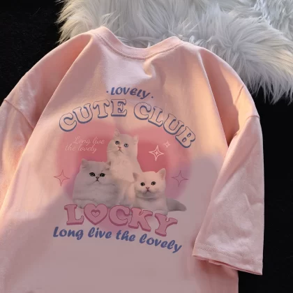 تي شيرت بناتي من القطن الخالص بأكمام قصيرة تي شيرت نسائي لطيف مطبوع عليه قطة 2024 صيفي نمط جديد للأطفال نصف كم علوي عصري