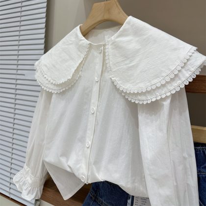 Girls' Shirt Spring Women's Sweet Lady Double Layers Large Lars Ruffled Collar Puff Sleeve Long Sleeve Top