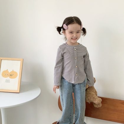 قميص بناتي مخطط قاع 2023 خريف وشتاء تي شيرت جديد حلو وحار قصير بأكمام طويلة تي شيرت نسائي مناسب تمامًا على الطراز الكوري