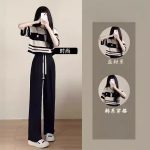 Girls' striped short-sleeved top for junior high school students suit summer fashionable western style casual pants two-piece set