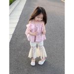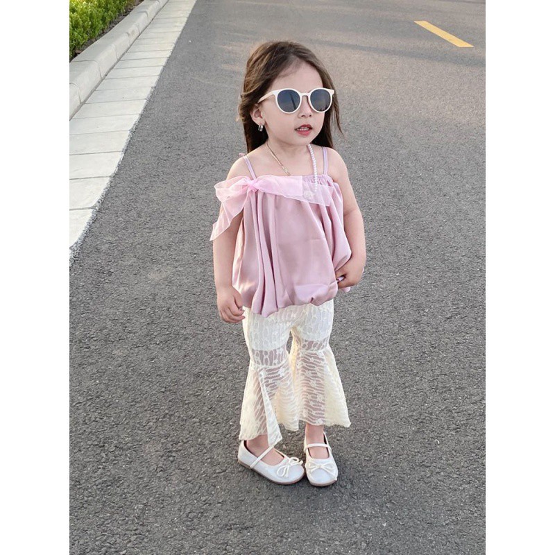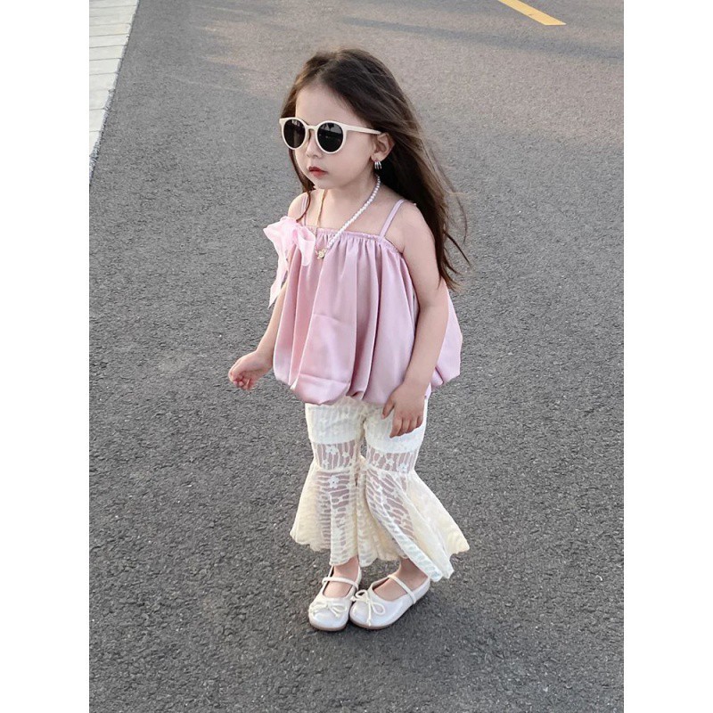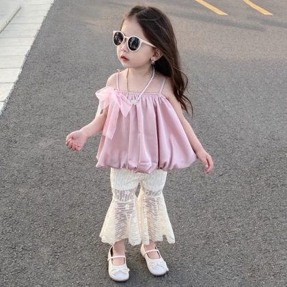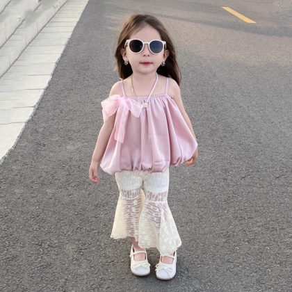 | nameOriginal | Girls' Summer Bow Strap Top 2024 New Korean Style Baby Girl's Western Style Lace Flared Pants Two-piece Set |