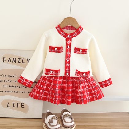 | nameOriginal | Girls' sweater suit skirt golden edge Chanel style simple style knitted two-piece skirt baby girls' Western style cardigan long sleeve |