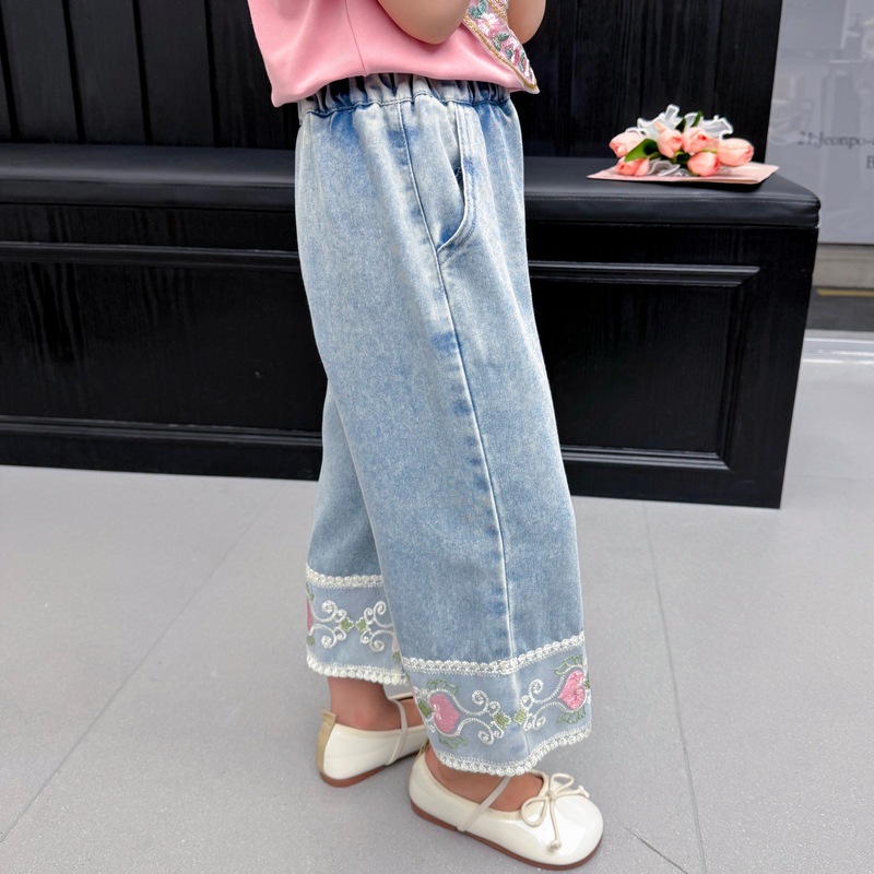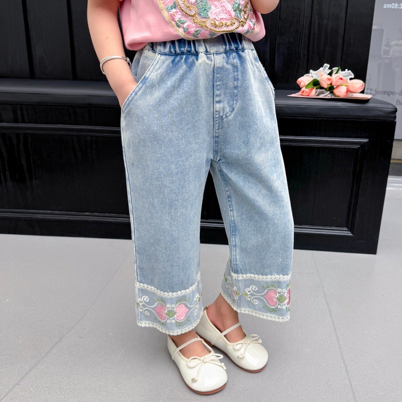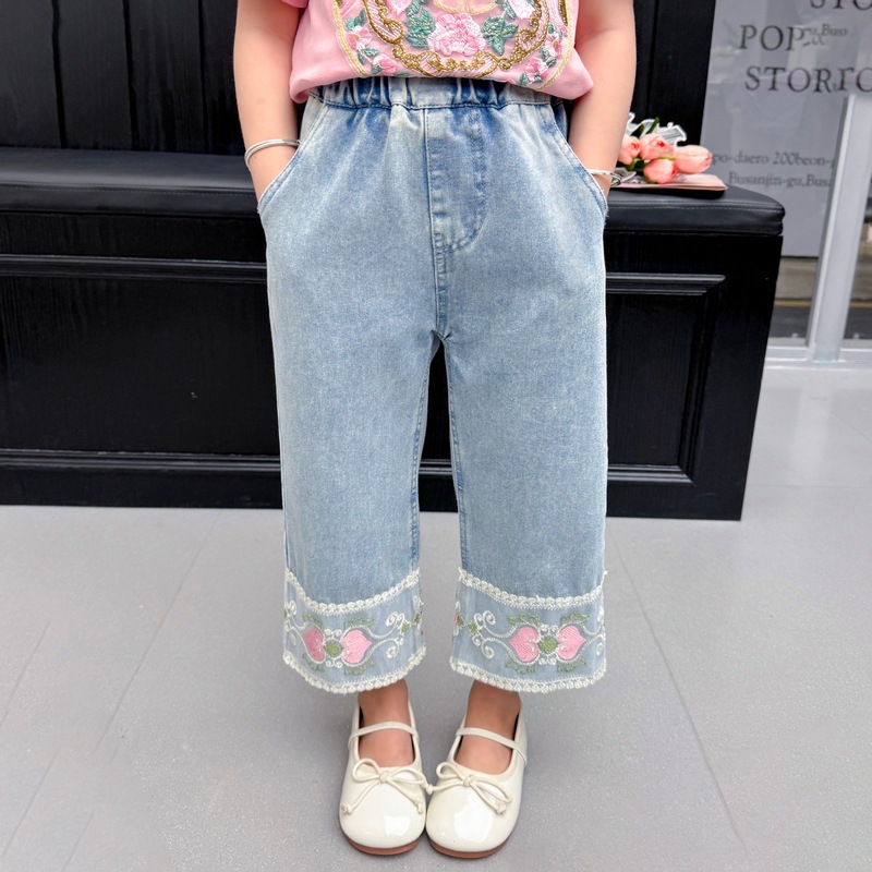 Girls' Tencel Lace Denim Straight Pants 2024 Summer New Stylish Children's Wear Baby Girls' Casual Pants