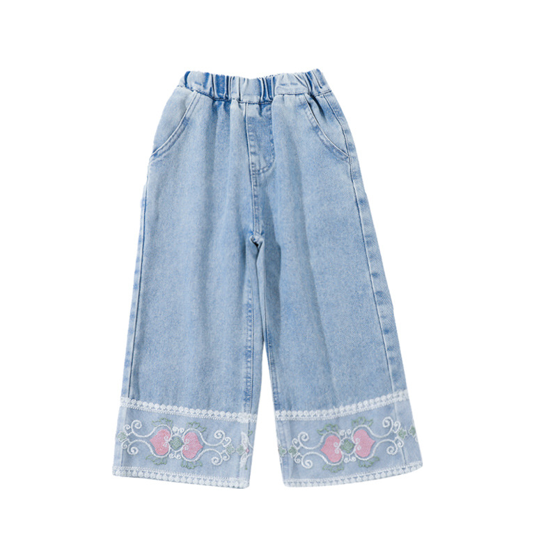الفتيات ايوسل الدانتيل الدنيم السراويل المستقيمة 2024 صيف جديد أنيق ثوب أطفال طفل الفتيات سراويل تقليدية