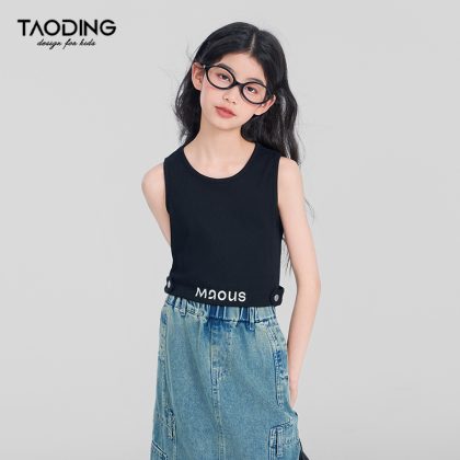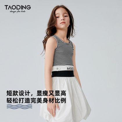 سترة الفتيات صيف 2024 نمط جديد للأطفال المتوسطة والكبيرة من القطن الخالص بدون أكمام مخطط قصير مطبوع قاعدة حبال غير رسمية