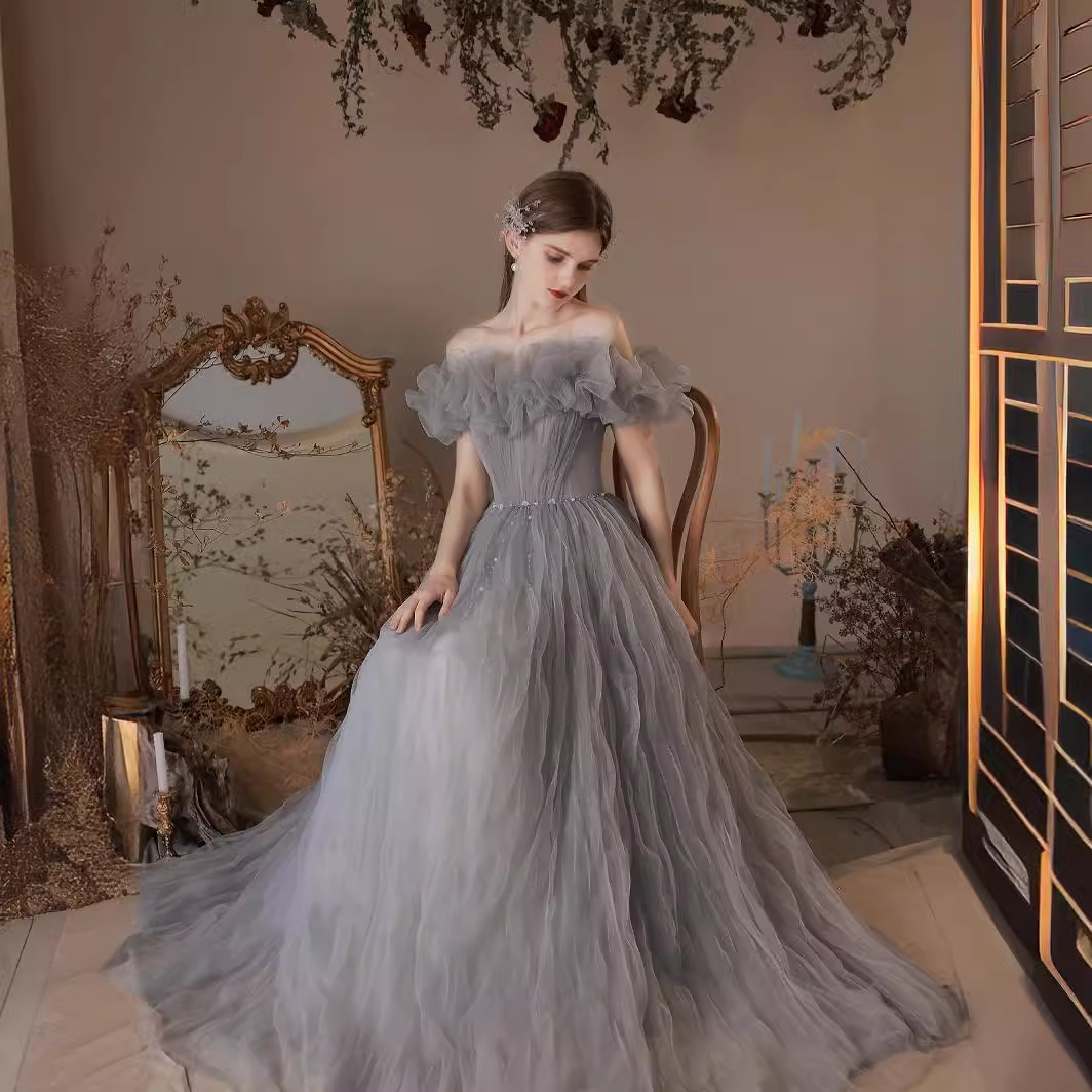 | nameOriginal | Gray evening dress 2024 new off-shoulder fairy temperament engagement design sense student art exam evening dress for women |