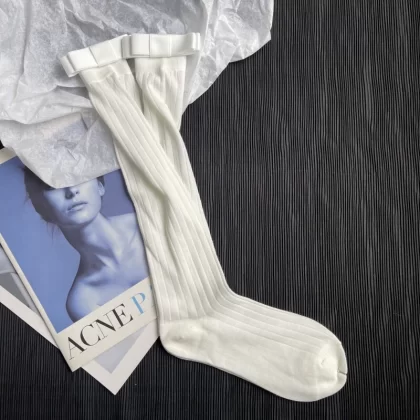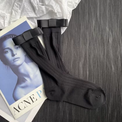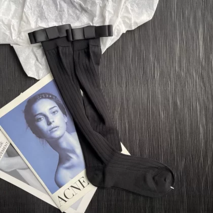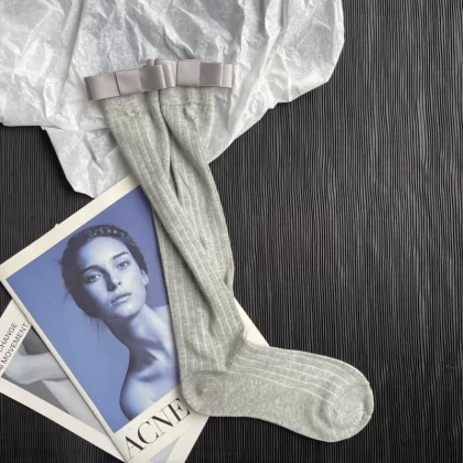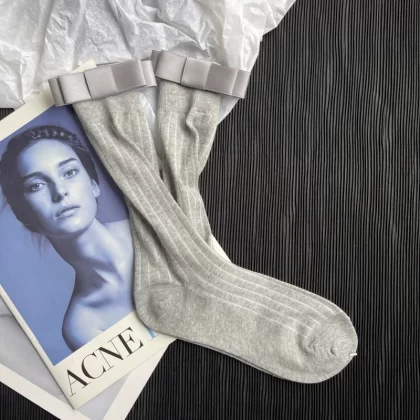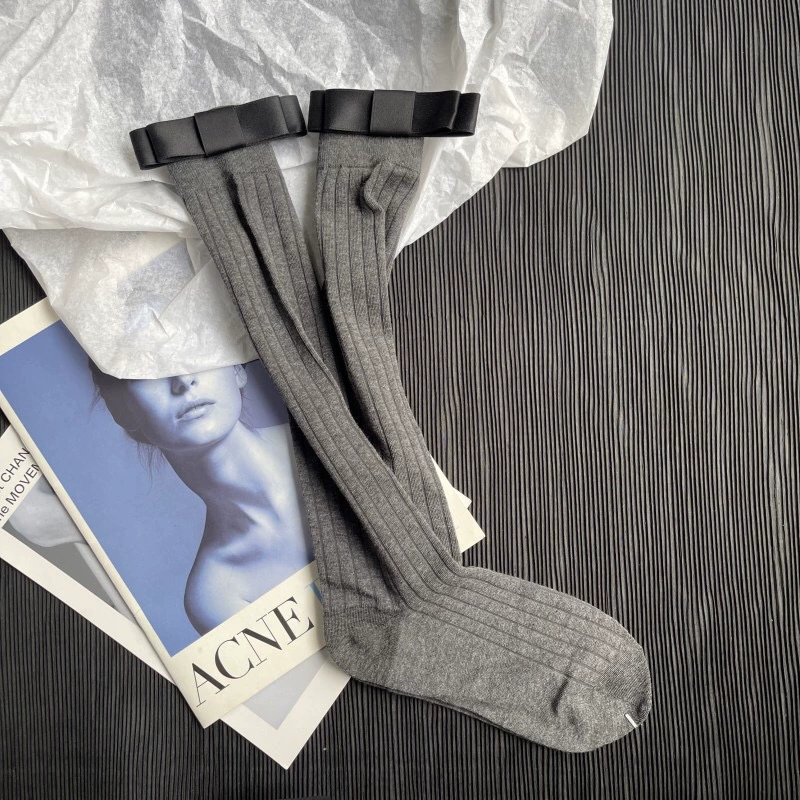 Gray vertical striped ultra-thin slimming summer stockings three-dimensional double-layered bow versatile Internet celebrity mid-calf pile socks
