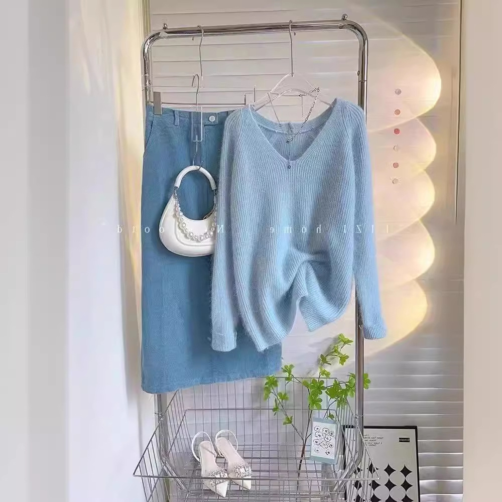 | nameOriginal | Guangzhou Sanxing high-quality blue V-neck raccoon velvet sweater women's soft glutinous loose lazy style knitted top |
