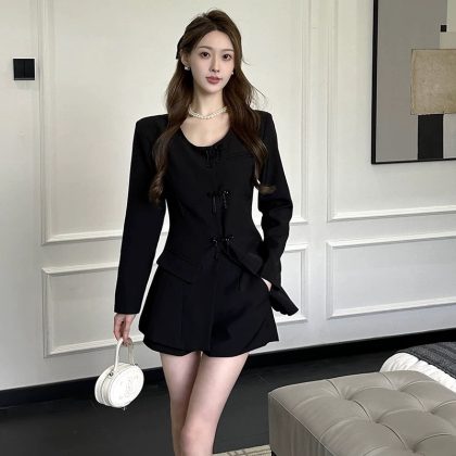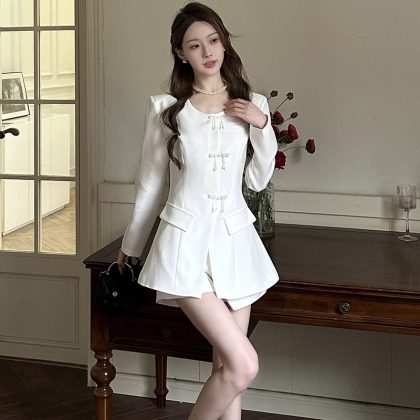 Guofeng Buckle Suit Women's Spring and Summer New Tall Wide Leg Shorts Tight Waist Slimming Round Neck Suit Two-Piece Suit
