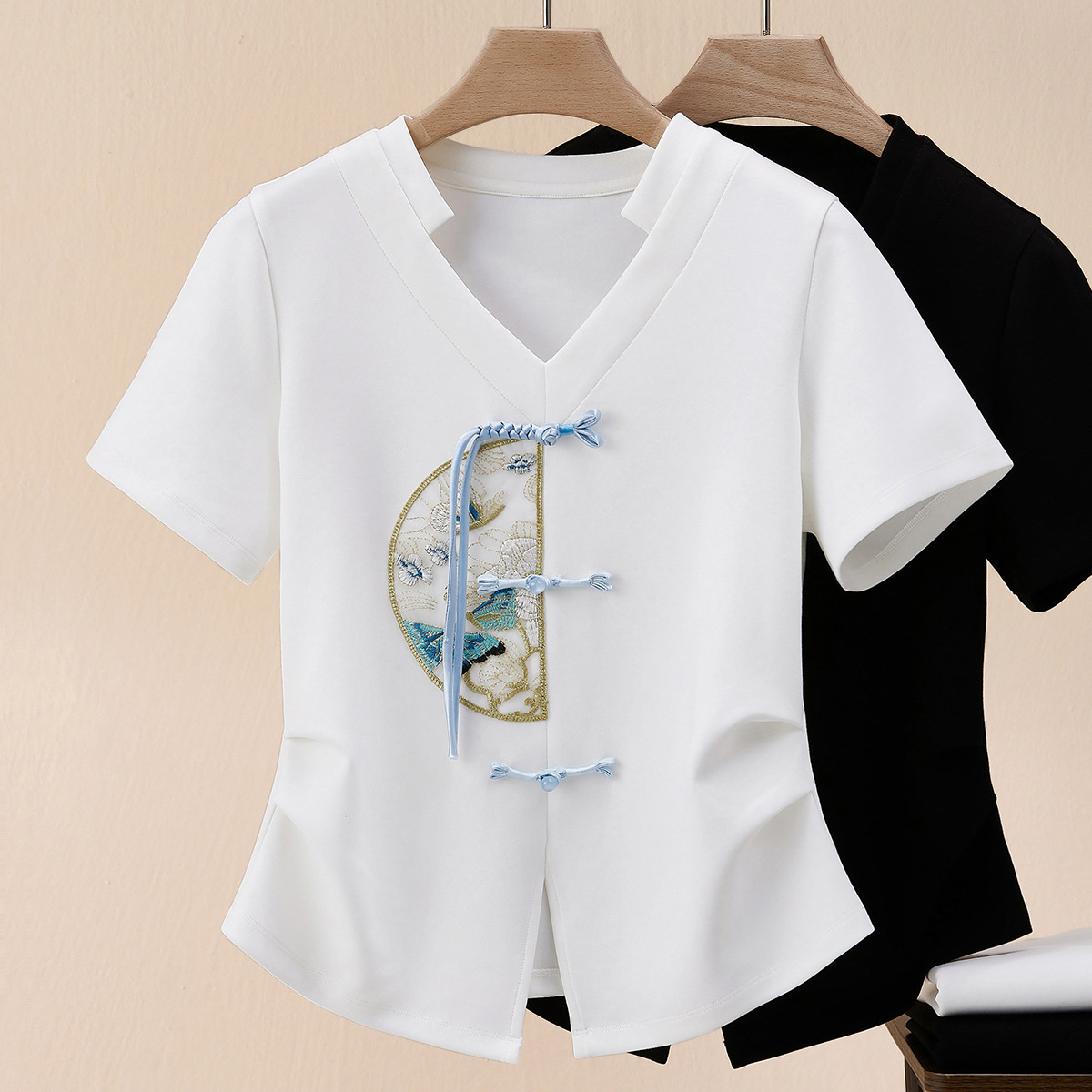 | nameOriginal | Guofeng Buckle Top Women's Summer 2024 New Retro New Chinese Unique Chic White T-shirt Women's V-neck Short Sleeve |
