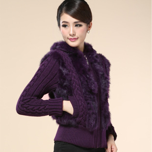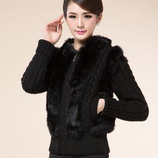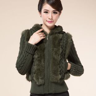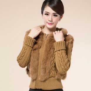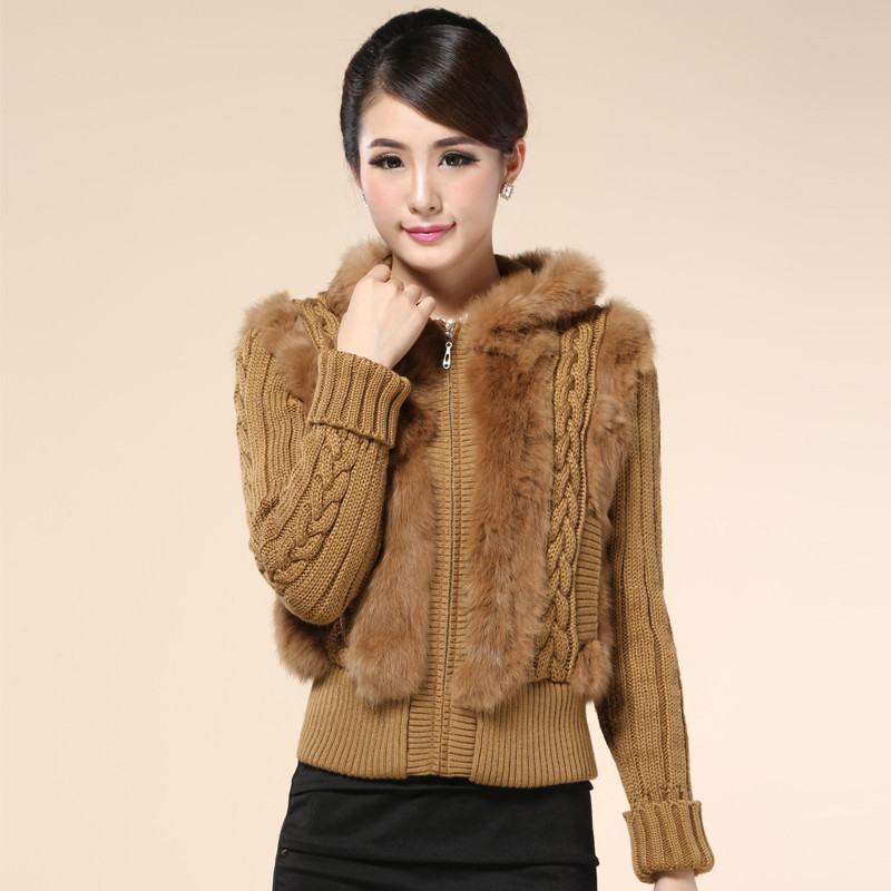 Haining fur 2022 new ladies rabbit fur sweater coat short knitted wool cardigan with hat spring and autumn