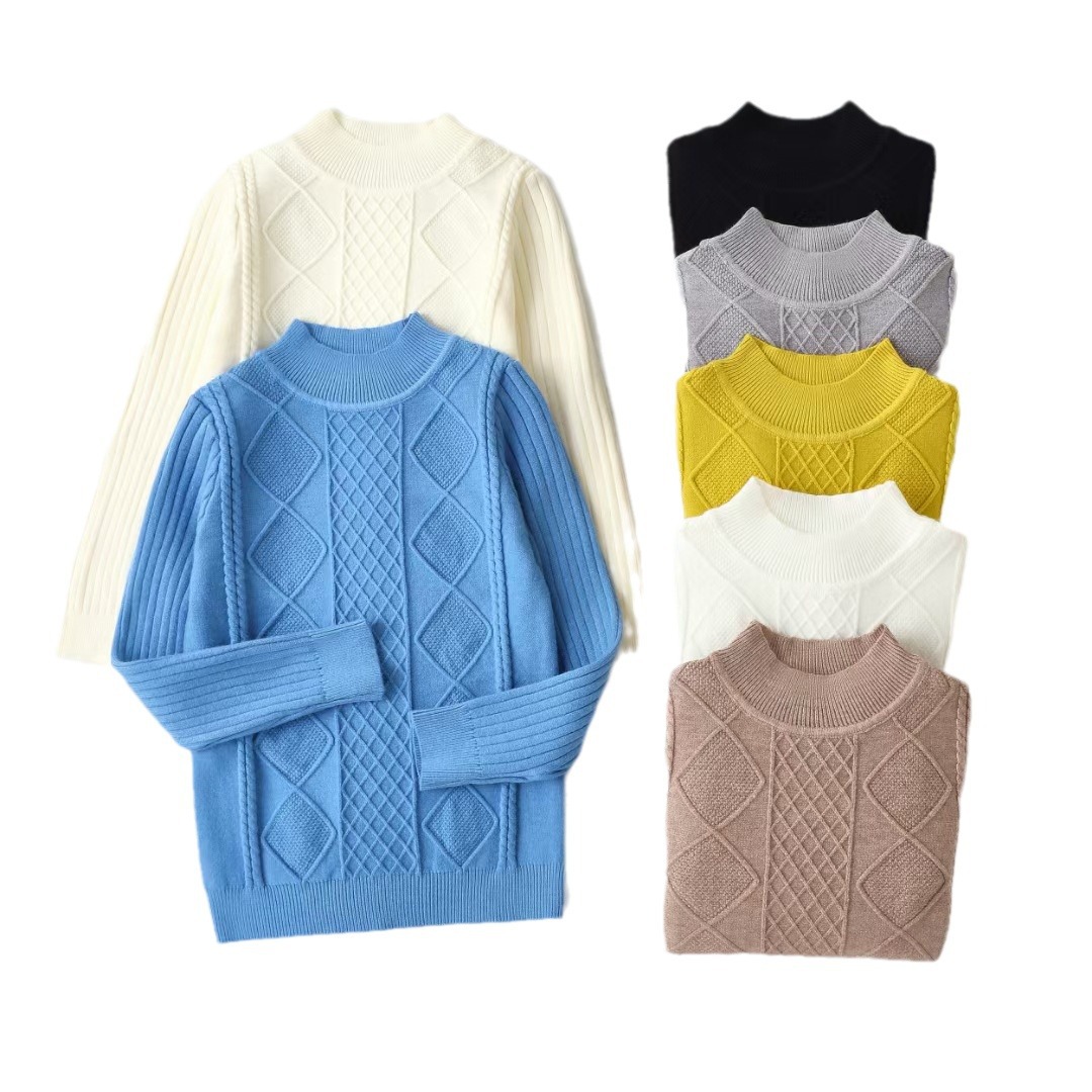 | nameOriginal | Half-high collar autumn and winter new boys and girls baby soft waxy top children's round neck solid color diamond twist flower sweater |