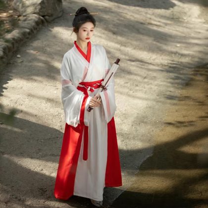 هان يو كوي هان يو كوي الأصلي هانفو أنثى [Mo] جين صنع طبقة مزدوجة طوق متقاطع أعلى الخصر طول تنورة ثلاث قطع مجموعة للعشاق