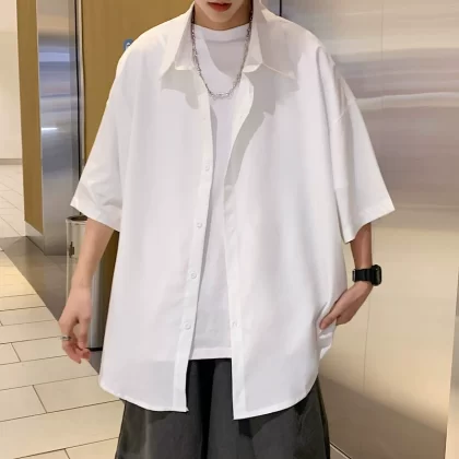قميص هاراجوكو ذو ثنيات بسيطة كاجوال بأكمام قصيرة