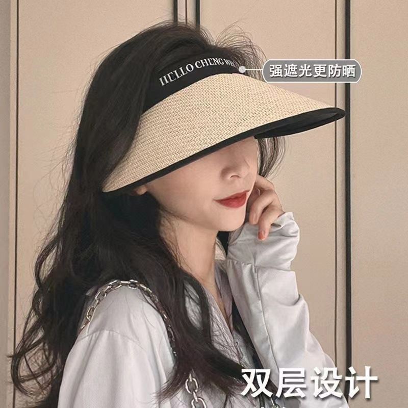 Hat women's summer UV all-match straw top sun hat letter headband black glue big brim sun protection sun hat