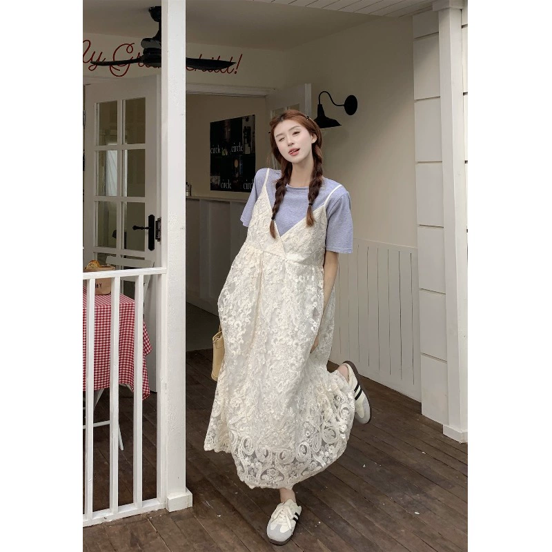 Heavy embroidery lace suspender dress for women spring 2024 new style small fresh layered V-neck loose long skirt