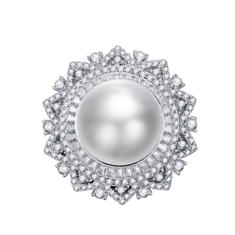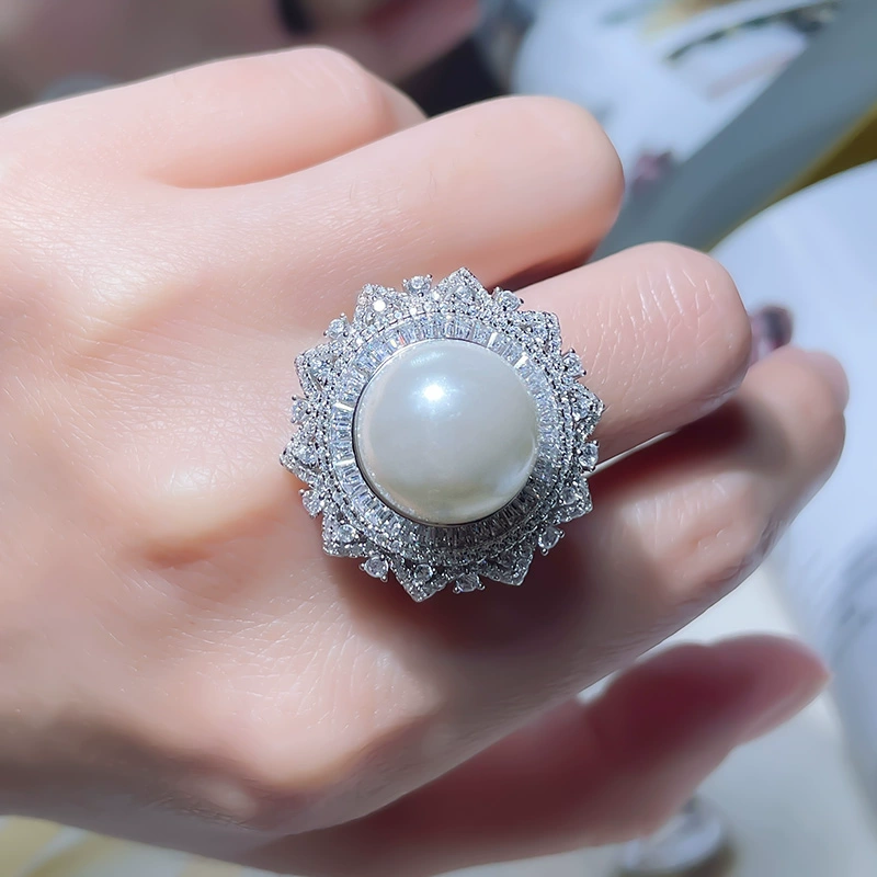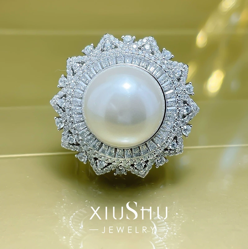 الصناعة الثقيلة الفاخرة الأم لخاتم اللؤلؤ المليئة بالماس أسترالي أسترالي الضوء القوي جولة 925 فرقة الفضة الأصابع مبالغ فيها مجموعة مجوهرات كبيرة