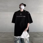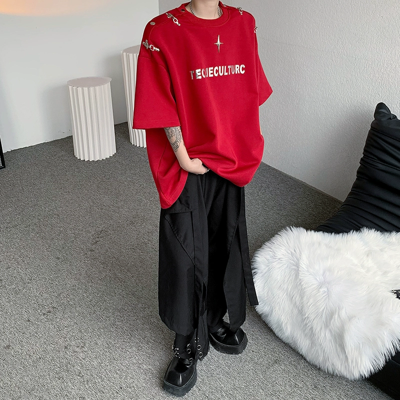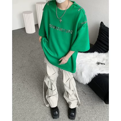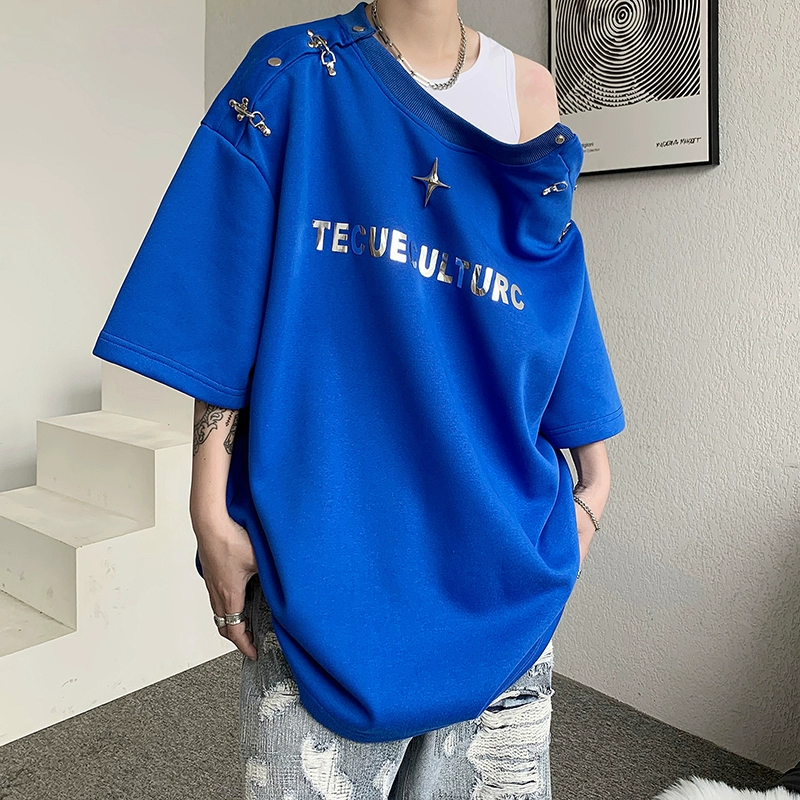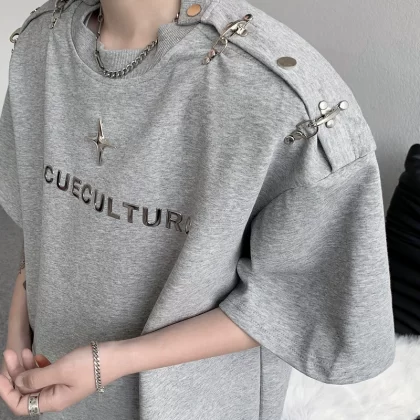 Heavy shoulder padded metal buckle deconstructed half-sleeved trendy top