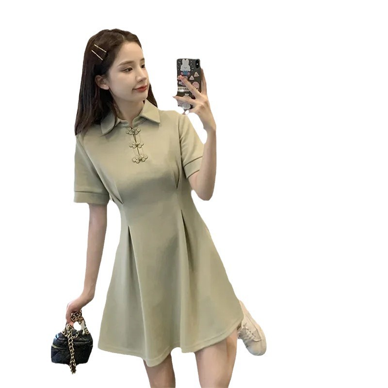 Hepburn New Chinese-style Buckle POLO Collar Black Skirt Summer plus size Short-sleeved Casual T-shirt dress Chubby Girl