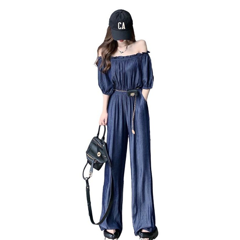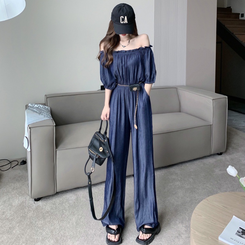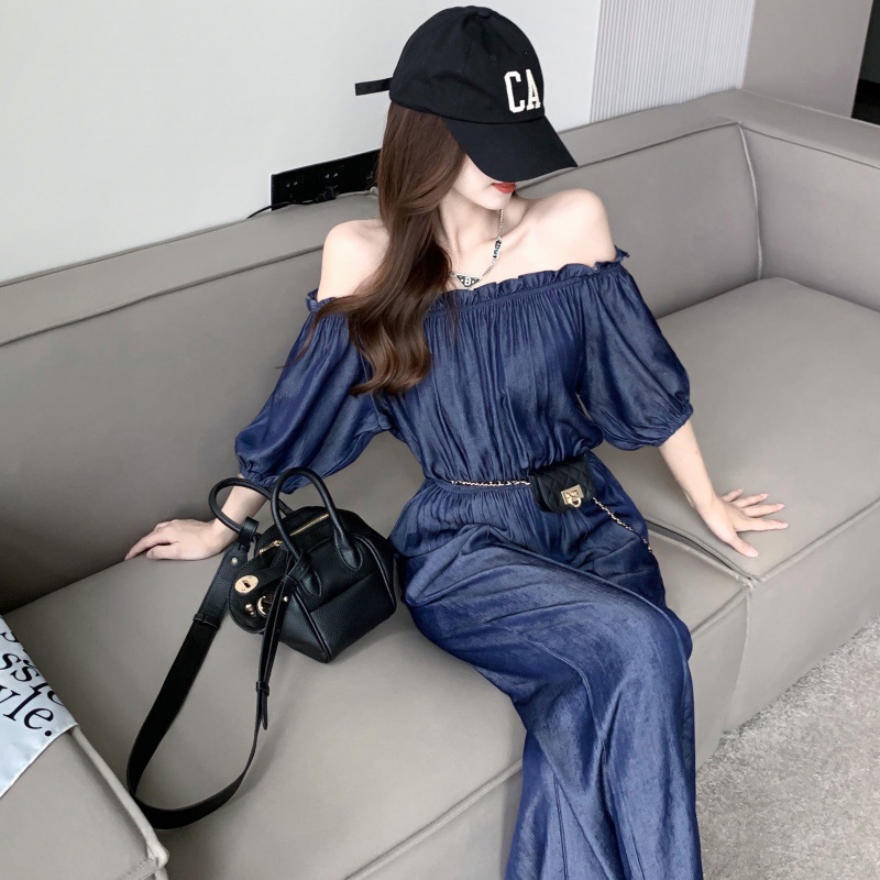 | nameOriginal | High-end blue off-shoulder jumpsuit 2023 Summer new high waist slimming denim color draped wide leg jumpsuit |
