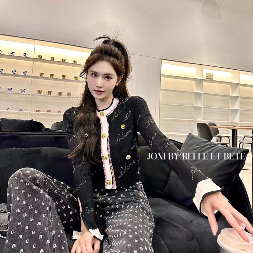 | nameOriginal | High-end European niche design heavy luxury black and white rhinestone gold buckle bell sleeve knitted cardigan top for women |