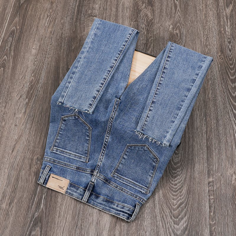 جينز نسائي عالي الخصر لربيع 2024 سروال ضيق جديد ضيق ومظهر نحيف صغير مقصوص للارتداء الخارجي