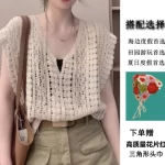 سترة كروشيه مجوفة برقبة على شكل حرف V صيفية بتصميم عصري جديد مع بلوزة على الطراز الكوري بدون أكمام للسيدات