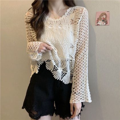 Hollow-out Knitted Blouse Women's Summer Loose Thin Sunscreen Air-conditioning Shirt Design Sense Outer Chic Lace Short Top