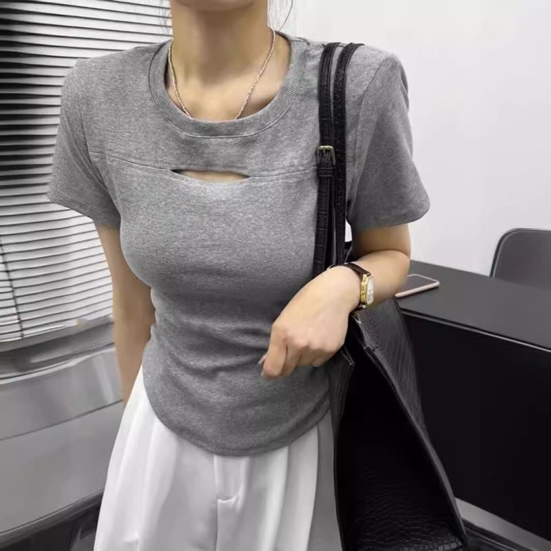 nameOriginal | Hollow Shoulder Short-sleeved T-shirt Women's 2024 Summer New Irregular Design Sense Niche Short Top Ins |