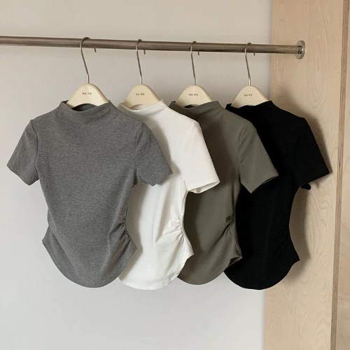 | nameOriginal | Homemade pleated waist half turtleneck short-sleeved shoulder T-shirt for women new summer design slim hot girl solid color top |