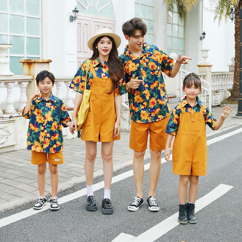 Hong Kong-style parent-child outfit summer 2024 new fashion family of four retro style short sleeve color shirt home decoration suit