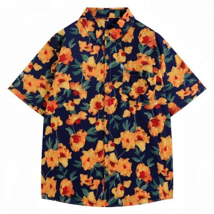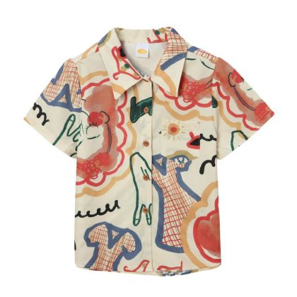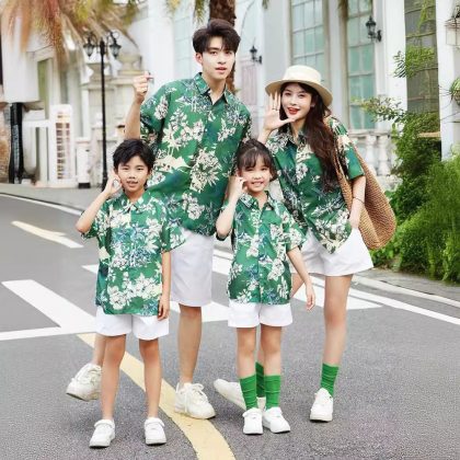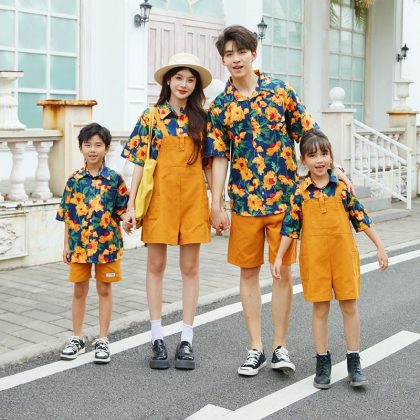 ملابس الوالدين والطفل على طراز هونج كونج لصيف 2024 موضة جديدة لعائلة مكونة من أربعة قميص ملون بأكمام قصيرة بتصميم عتيق بدلة تزيين المنزل