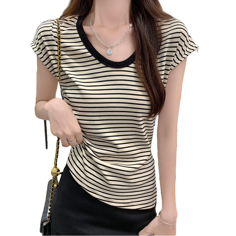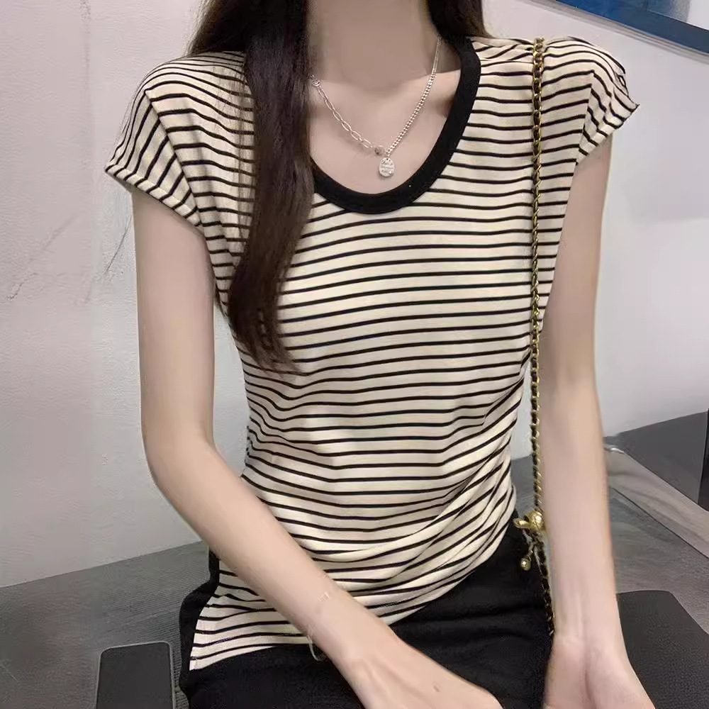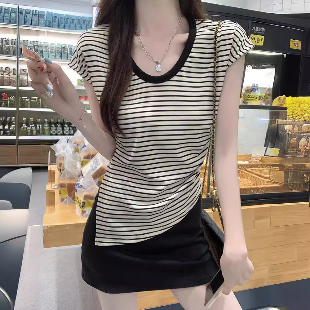 | nameOriginal | Hong Kong Style Retro Chic Striped Contrast Color Round Neck Short-sleeved T-shirt Women's 2024 New Summer Design Niche Top |