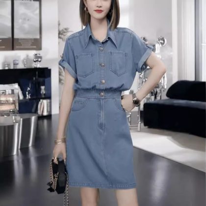 | nameOriginal | Hong Kong Style Retro Thin Short-sleeved Denim dress Women's Summer 2024 New Style Small Waist Slimming A- line Skirt |