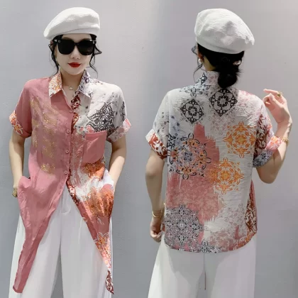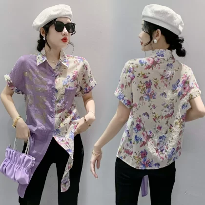 قميص عصري بأكمام قصيرة معقود بحاشية فضفاضة من حجر الراين الساخن
