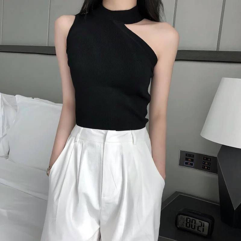 قميص قصير محبوك من الحرير الجليدي للنساء ملابس خارجية ذات قاعدة داخلية مثيرة قصيرة مكشوفة الكتفين على الطراز الكوري قطعة علوية رفيعة