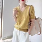 | nameOriginal | Ice Silk Knitted Shirt Short-sleeved V-neck T-shirt Women's 2024 Summer Top Women's Puff-sleeved Hollow Shirt Loose Slim-fit |