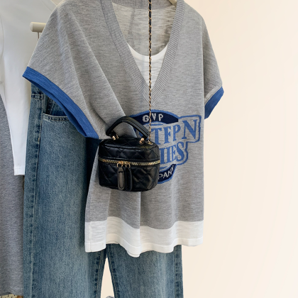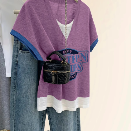 | nameOriginal | Ice silk knitted short-sleeved T-shirt for women summer 2024 new summer women's fake two-piece thin small flying sleeves right shoulder top |