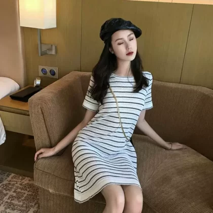 Ice silk striped short-sleeved T-shirt bottoming skirt loose summer dress