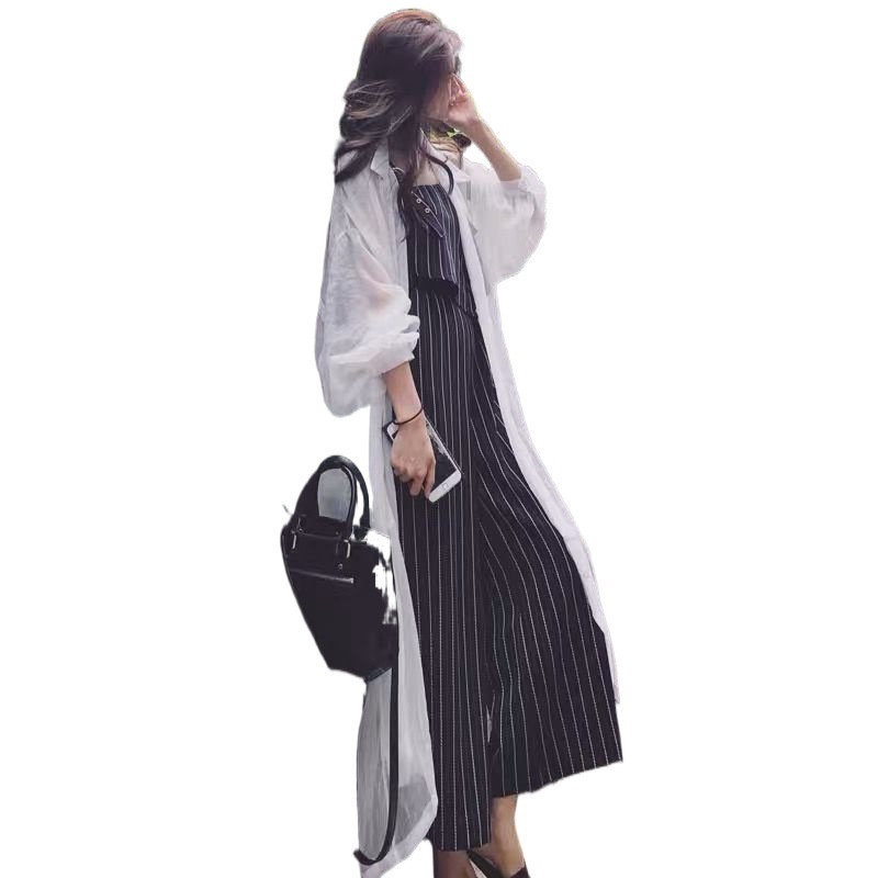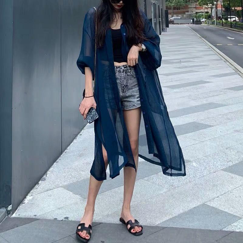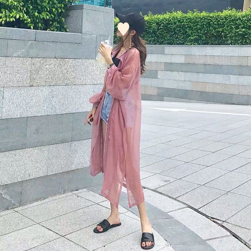 سترة حريرية واقية من الشمس طويلة صيفية جديدة عصرية للنساء معطف رقيق وأكمام منتفخة فرنسية علوية للشاطئ مقاس كبير للدعاية