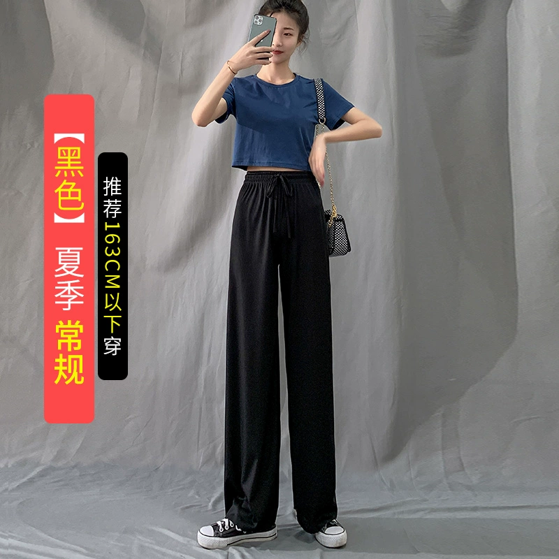 سروال أسود رفيع من الحرير الجليدي بخصر عالٍ ومستقيم وواسع الساق