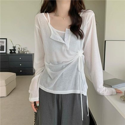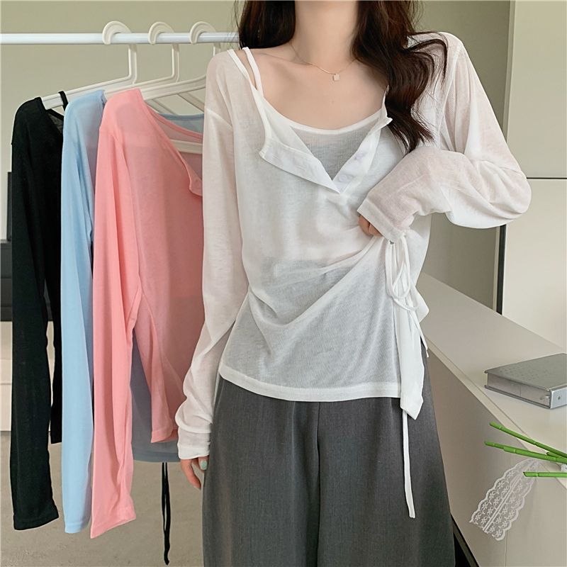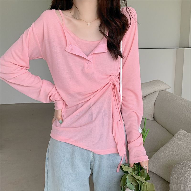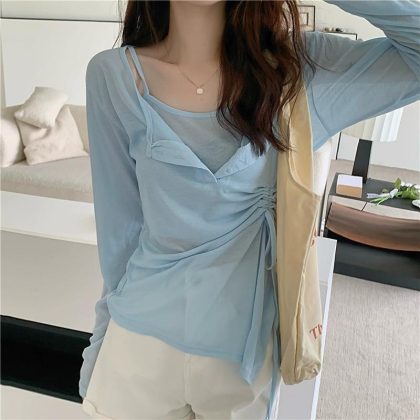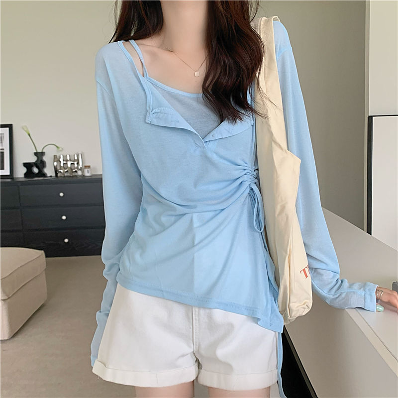 Inner Sling Drawstring Sunscreen Blouse T-shirt Women's Long Sleeve Summer Design Sense Niche Thin Top Two-piece Suit